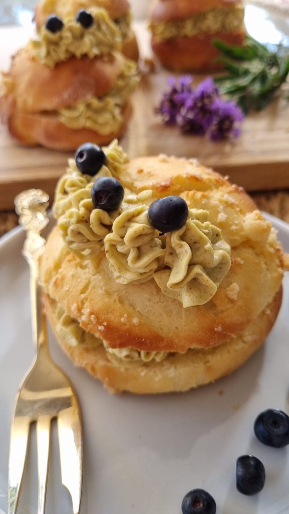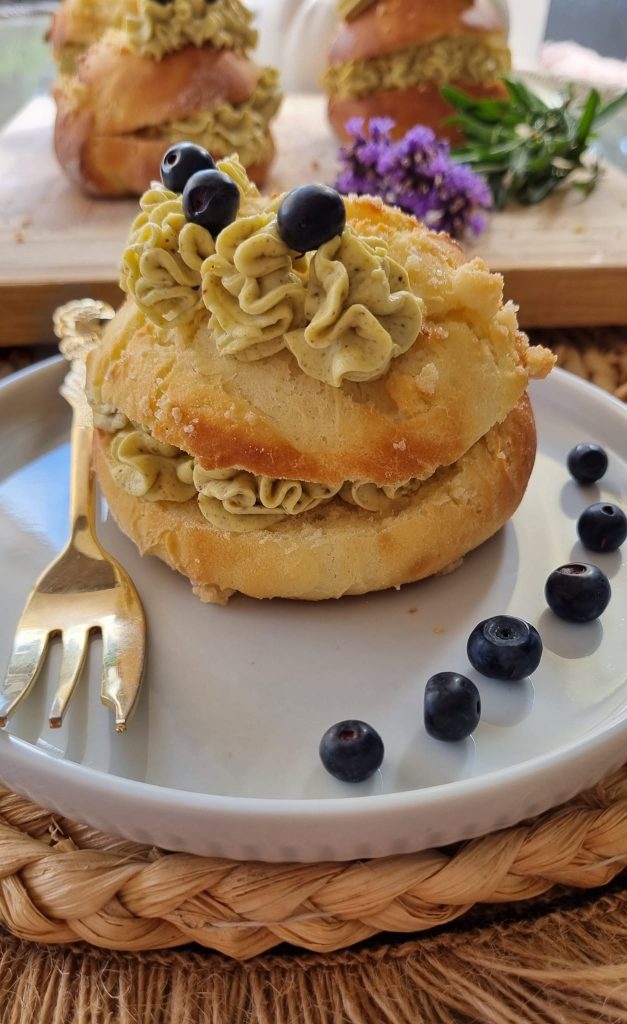 Piec 20-25 min (180-200°C). Bułki maślane udekorować po ostudzeniu krem pistacjowym.