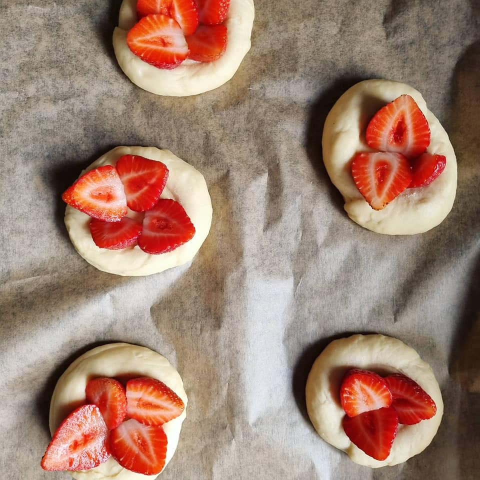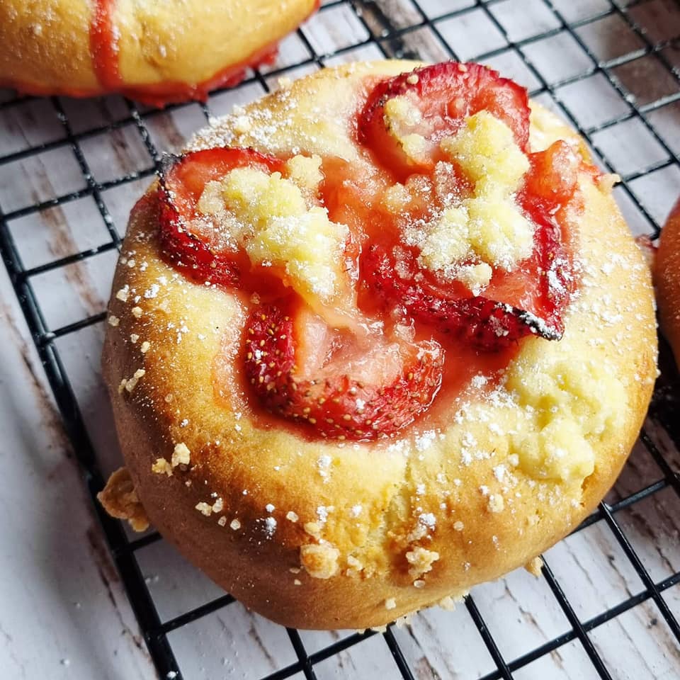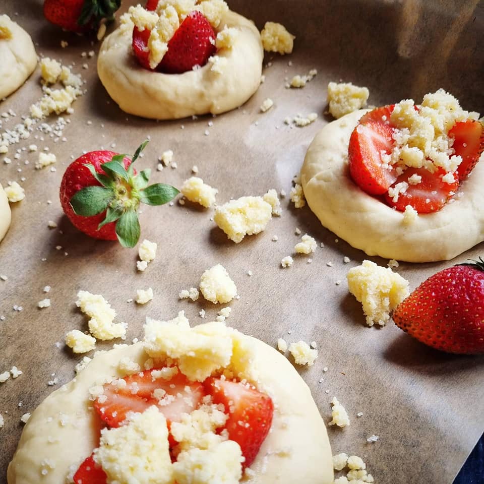 Następnie truskawki myjemy, osuszamy, kroimy na ćwiartki i układamy we wgłębieniu. Bułki smarujemy białkiem. Całość posypujemy wcześniej wykonaną kruszonką. Pieczemy 15 min w temperaturze 190’C (można wstawić do nienagrzanego piekarnika wówczas bułki nam bardziej wyrosną). Podajemy jak ostygną.