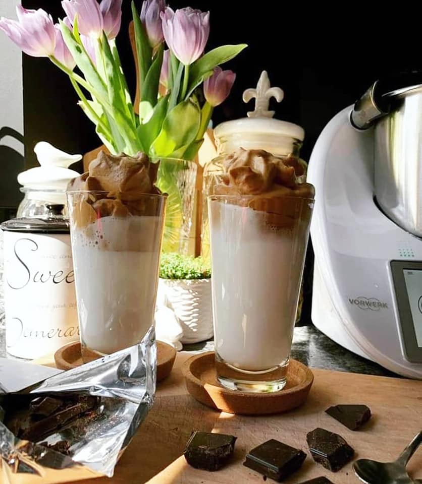 Ubijamy w thermomixie wodę, kawę i cukier – zakładamy motylek ! – 3 min/ 3,5 obroty Mleko ciepłe wlewamy do wysokiej szklanki i wykładamy ubita pianę kawową!