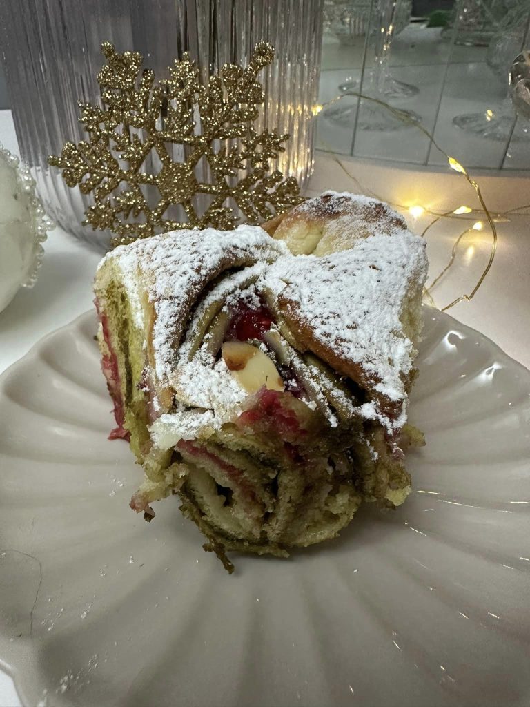 DROŻDZÓWKA Z PISTACJAMI, MALINAMI I BIAŁĄ CZEKOLADĄ
