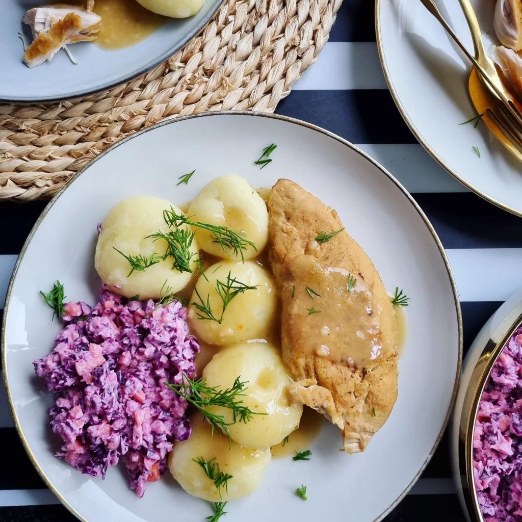 Polędwiczki podajemy z sosem, kluskami śląskimi i ulubioną surówką – u nas colesław z czerwonej kapusty.