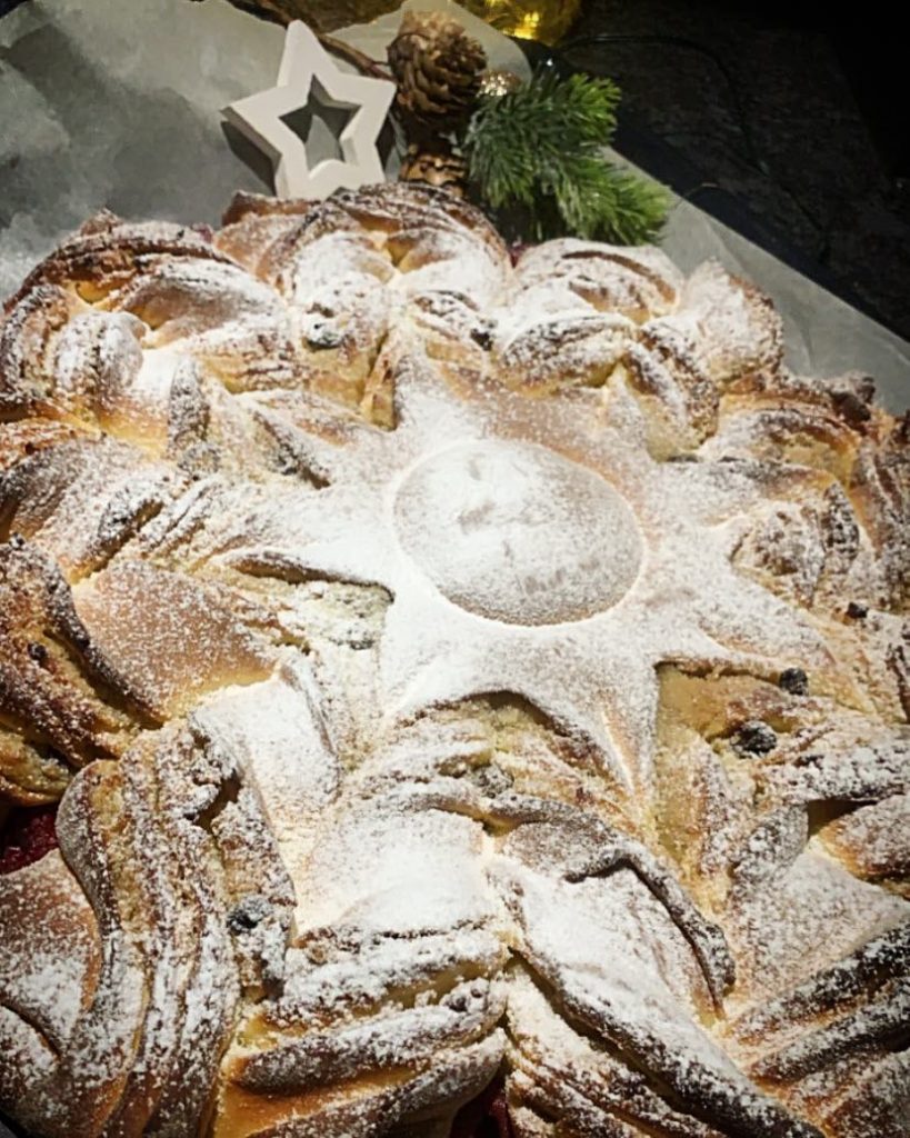 Na środku koła odciskamy lekko szklanką okrąg, który będzie nam pomocny w wycinaniu. Okrągłe ciasto kroimy na pół, później połówki na połówki tak żeby było 16 nacięć. Następnie wykręcamy dwa kawałki (parami do środka). Przykrywamy ściereczką zostawiamy na 15minut. W tym czasie nagrzewamy piekarnik.
