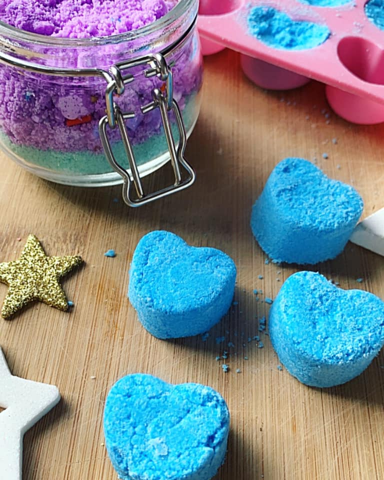 1. Do miski wsypujemy sodę oczyszczoną, mąkę, kwasek cytrynowy i barwnik w proszku (u mnie 1/4 łyżeczki) – mieszamy.