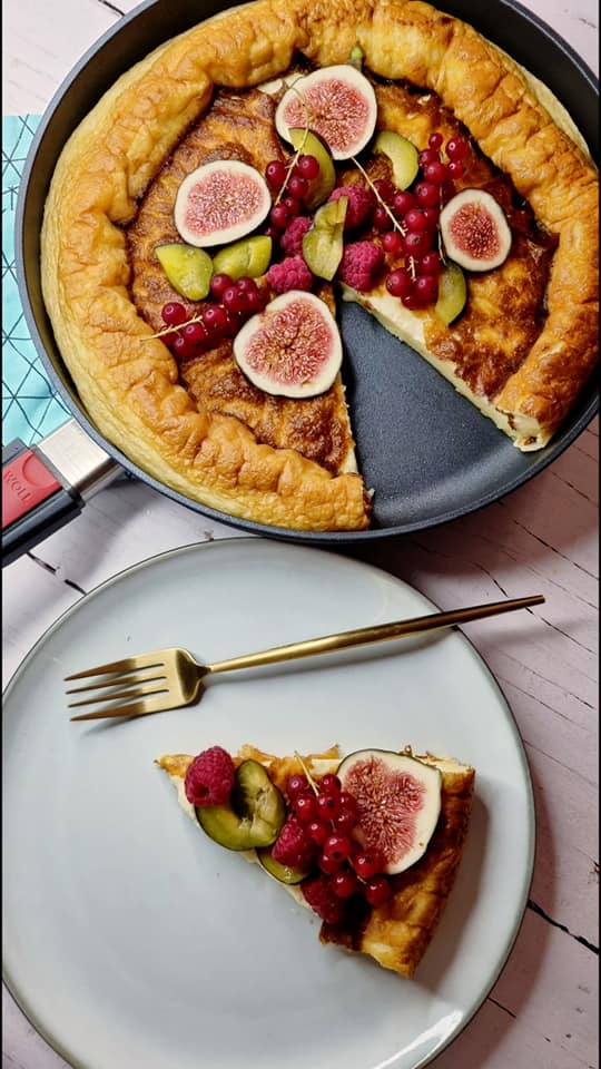 Piekarnik nagrzewane do 200’C. Mąkę, jajka, mleko, cukier miksujemy na gładką masę. Odsatwaimy na 20 minut. Patelnie nagrzewamy (w piekarniku lub na kuchence) i rozpuszczamy masło. Wylewamy ciasto na patelnie. Wkładamy do nagrzanego piekarnika. Pieczemy 25 minut. Podajemy z konfturą, owocami lub posypane cukrem pudrem