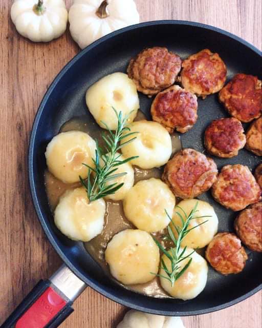 Po tym jak świetnie spisała się patelnia przy omlecie postanowiłam zrobić na niej pulpety indycze początkowo podsmażone lekko następnie duszone. Czas gotowania na patelni WOLL DIAMAND był krótszy niż na zwykłej, pulpety świetnie się zarumieniły. Pulpety następnie zalałam wodą, dodałam do nich garść suszonych grzybów i mnóstwo przypraw. Całość gotowałam pod przykryciem na wolnym ogniu ok 30 minut. Wyszły rewelacyjne ! Nie były suche jak można byłoby się spodziewać po mięsie z indyka.