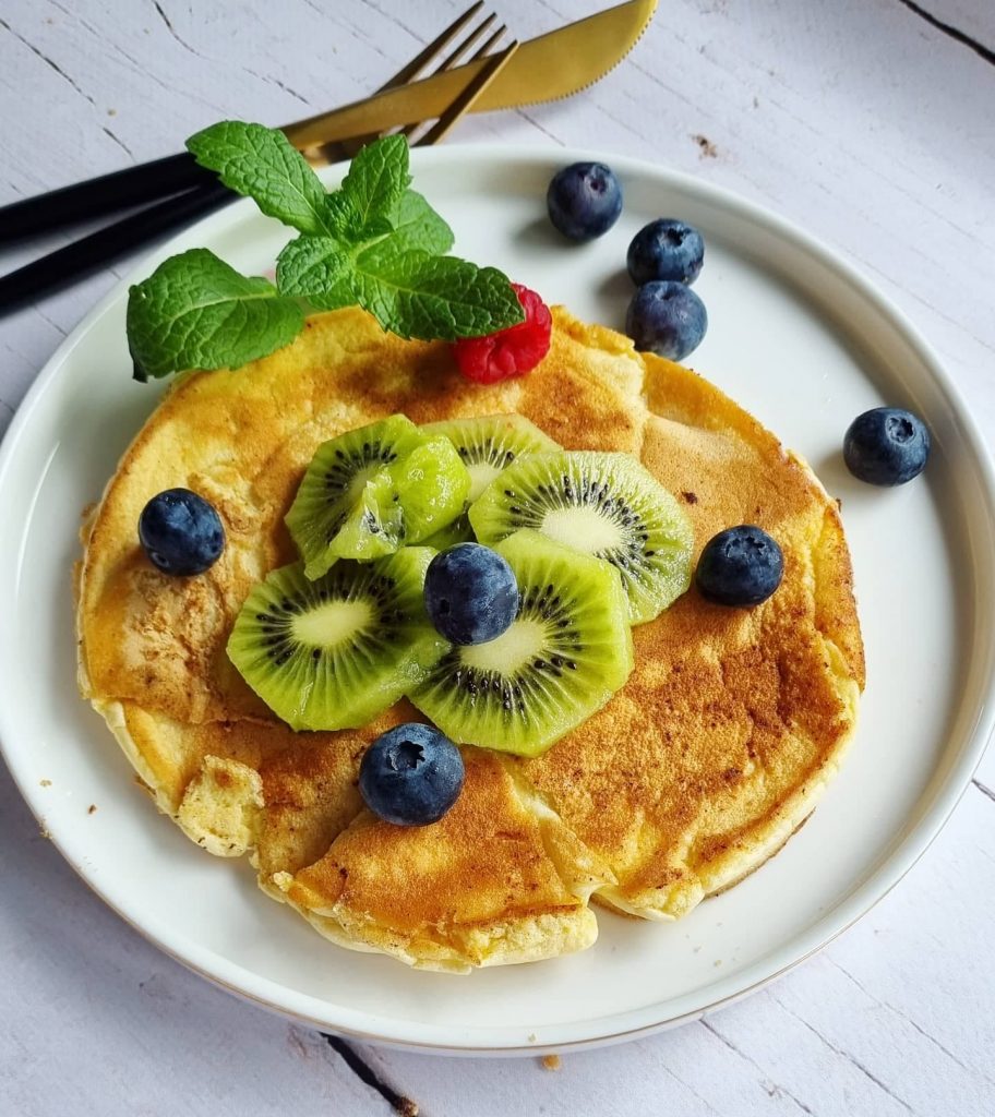 Białka ubijamy na sztywno z solą. Dodajemy żółtka, mąkę i proszek do pieczenia delikatnie mieszamy. Ciasto wylać na rozgrzane masło na patelni – podsmażyć z dwóch stron. Podawać z owocami lub wytrawni – rukola i pomidorki.