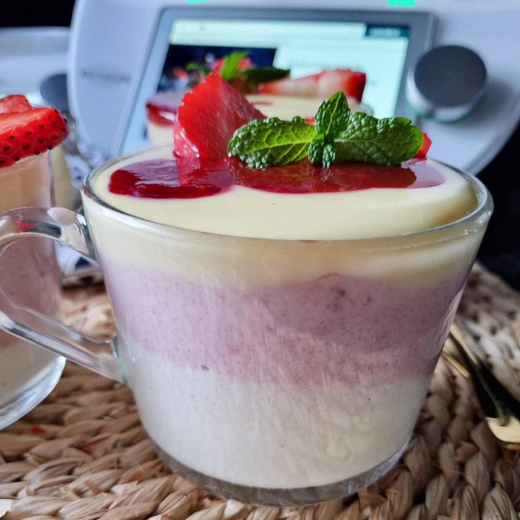 - Umieścić czyste naczynie miksujące w obudowie urządzenia Thermomix. Do naczynia miksującego w urządzeniu Thermomix wlać pozostałe 350 g mleka, dodać pozostałe 30 g cukru, skrobię, cukier waniliowy, żółtka i sól, podgrzewać 6 min/90°C/obr. 3. Powstałym sosem polać desery. Następne zrobić kleksa z sosu truskawkowego i ozdobić owocami. Smacznego.