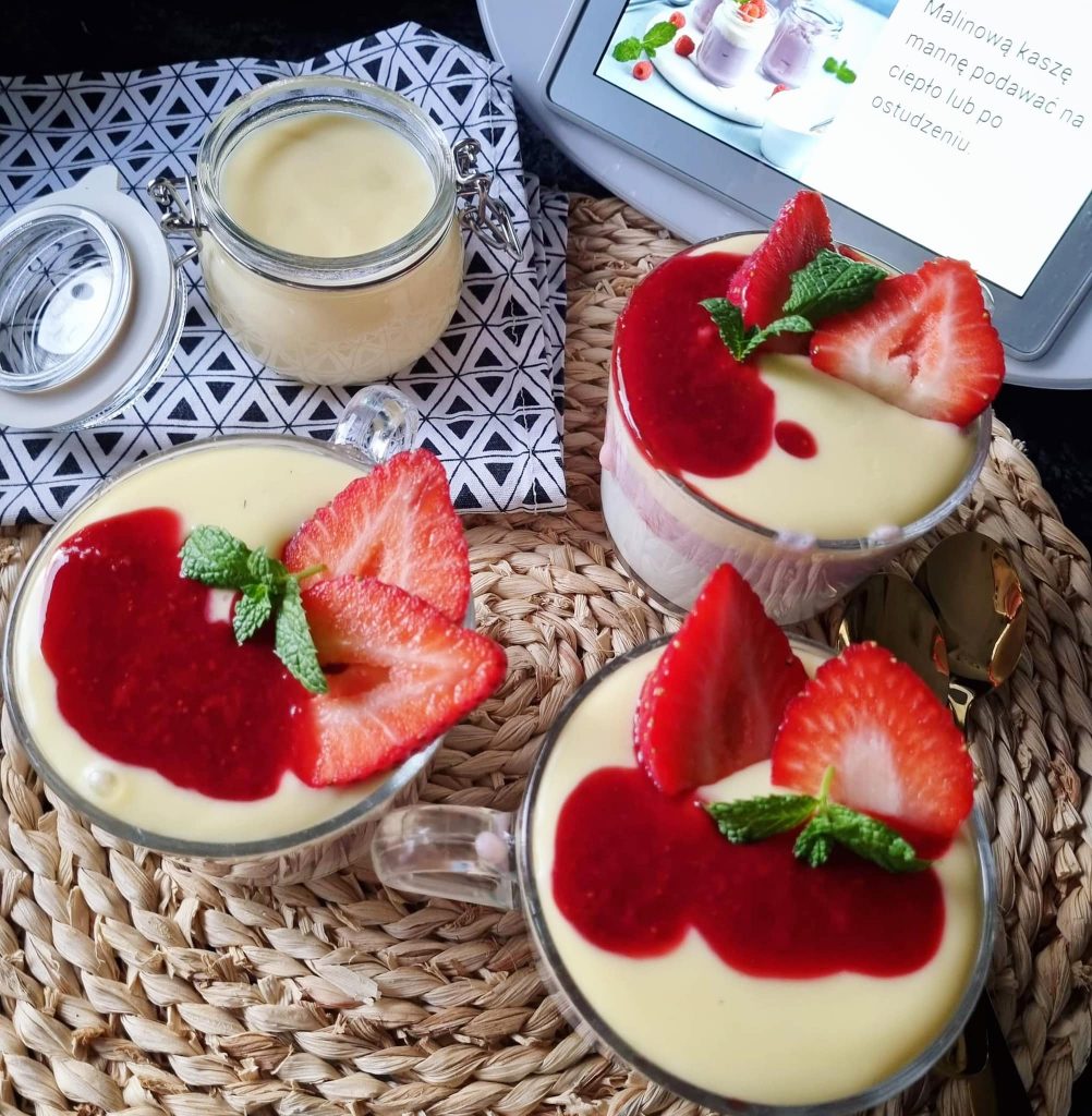 - . Do naczynia z kaszą manną wlać połowę musu, nastawić obr. 3/1 minuta wymieszać. Rozlać do szklaneczek na waniliową warstwę kaszy manny.