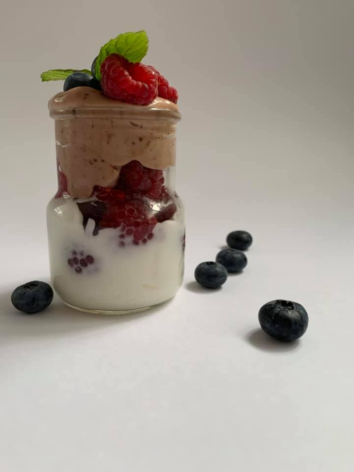 Do jednej dodajemy kakao i mieszamy. Cześć biała wkładamy do słoiczka. Przykrywamy spora częścią malin. Wykładamy warstwę z kakao. Dekorujemy. Opcjonalnie jeśli lubicie możecie dodać do białej warstwy wiórki kokosowe.