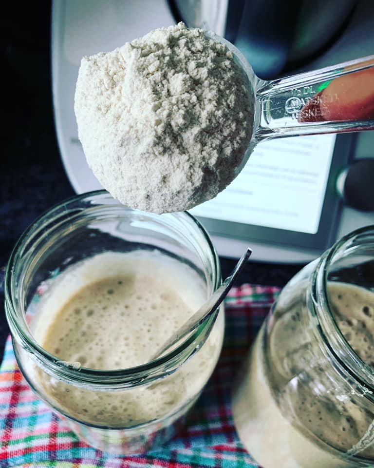1.Na pokrywie naczynia miksującego postawić duży słój (2 l), odważyć do niego 70 g przygotowanej wcześniej mąki żytniej, odstawić.